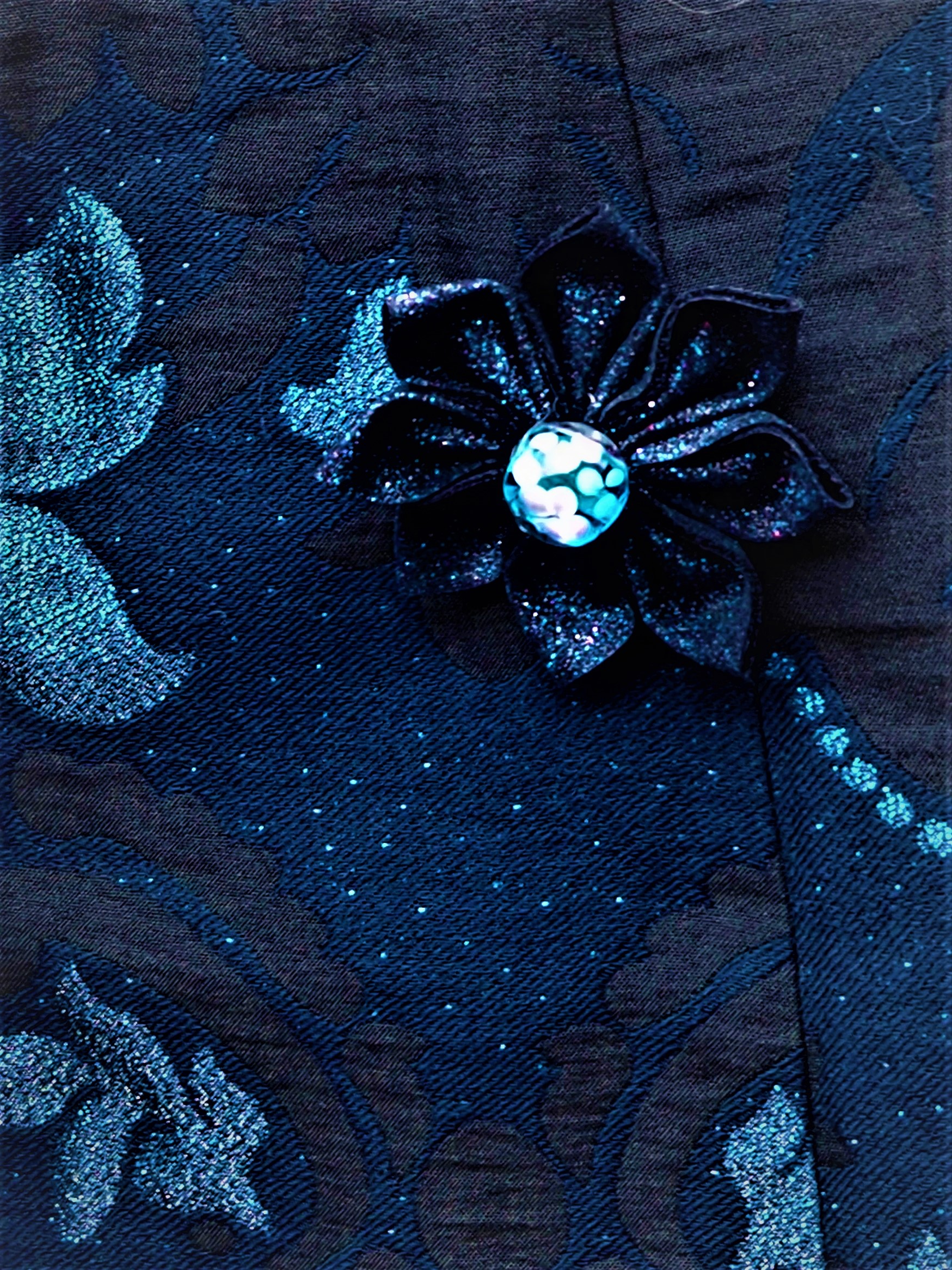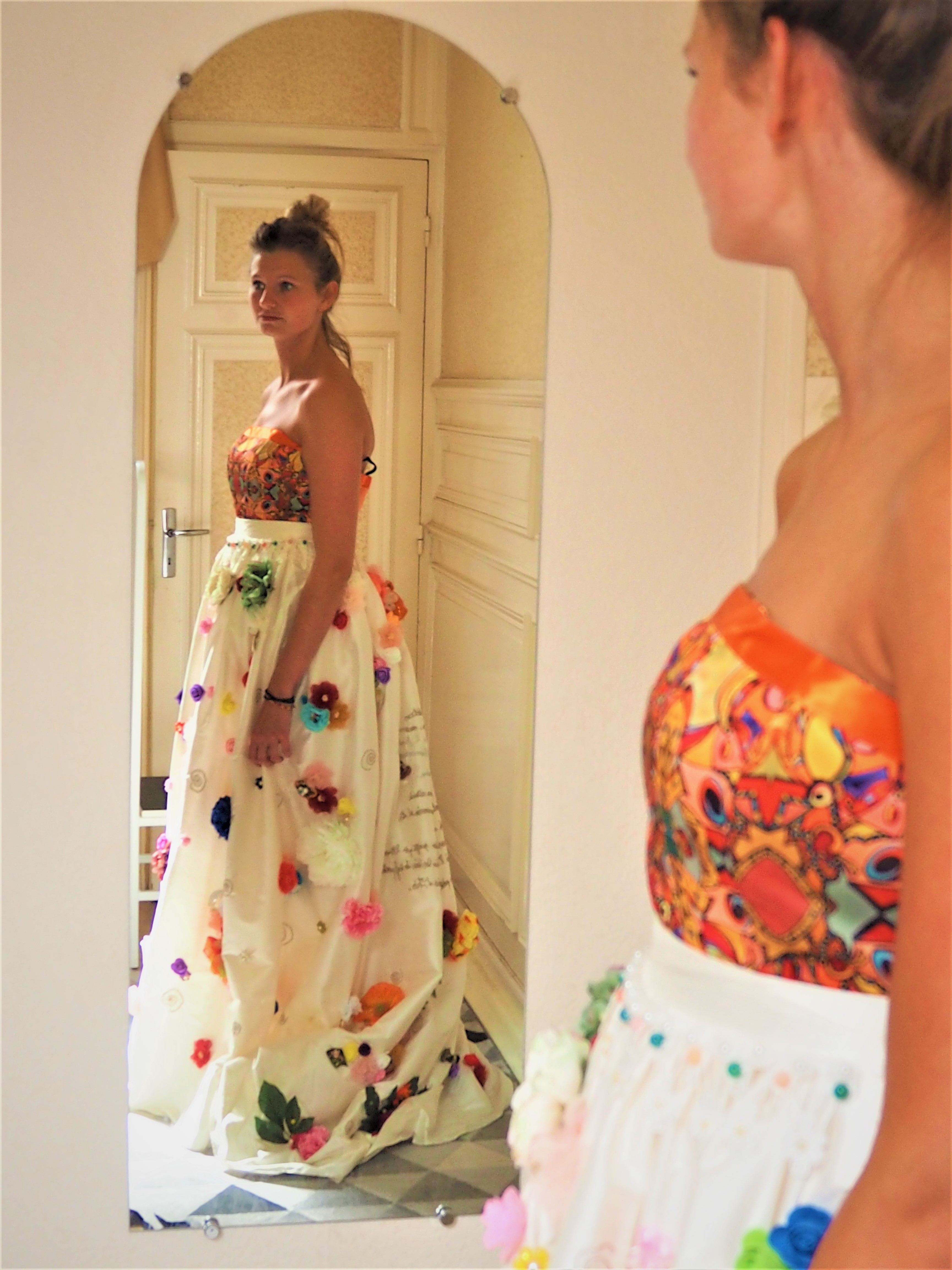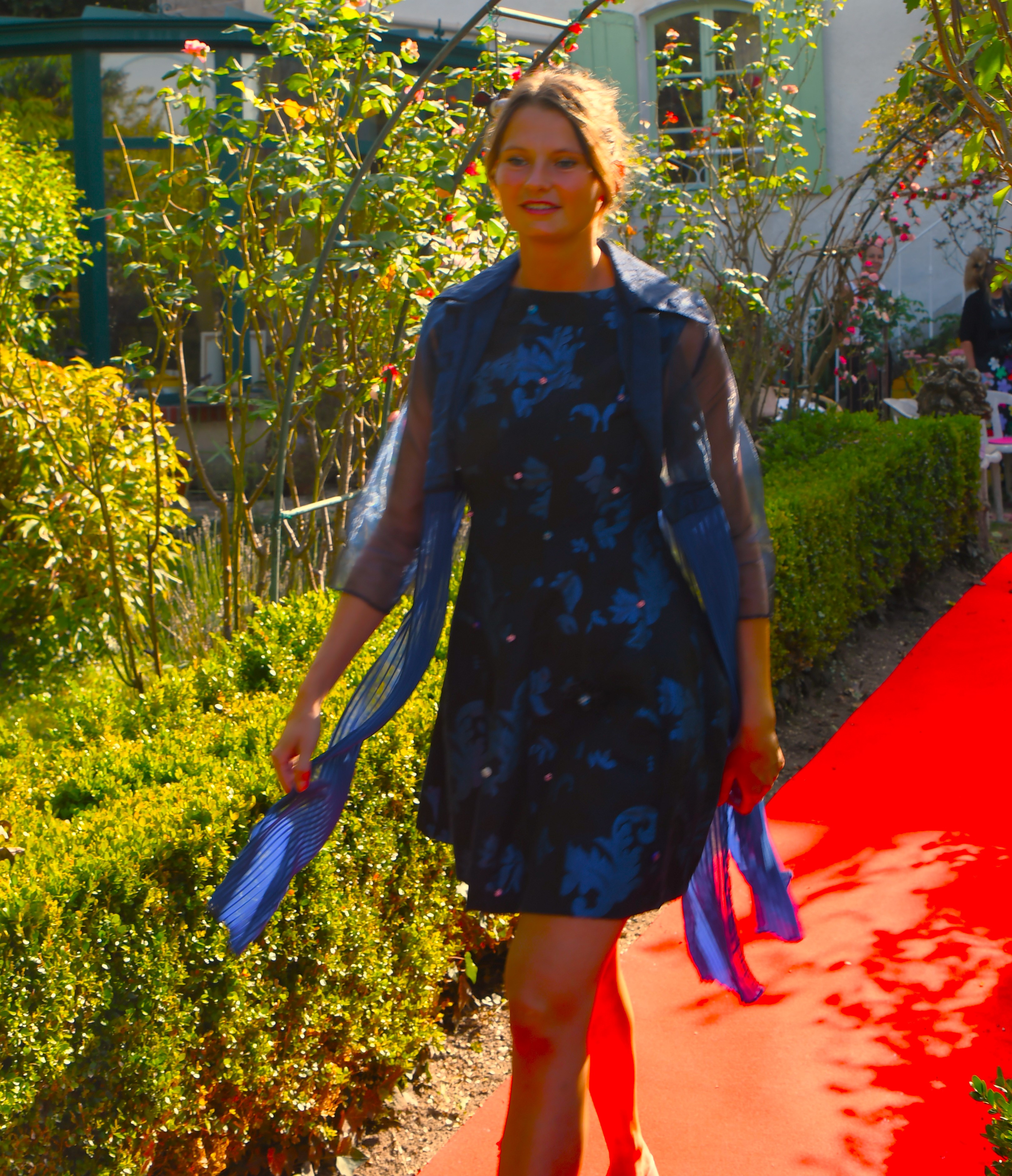 Luminescent reflète la lumière sur l’eau ; une réflexion méditative et lumineuse en fonction des ondulations, moirées dorées ou argentées. les tissus s’adaptent en fonction du modèle créé. Du bleu au mauve en passant par le vert, le rose et les transitions de tons, les modèles deviennent ensuite des créations originales et uniques. Les céramiques et les fleurs, papillons ou oiseaux en tissu participent de l’originalité de ces vêtements. (Mannequins : Léa M. et Victoria L., Aurélie W., Océane M. et Carine-Anne N.).