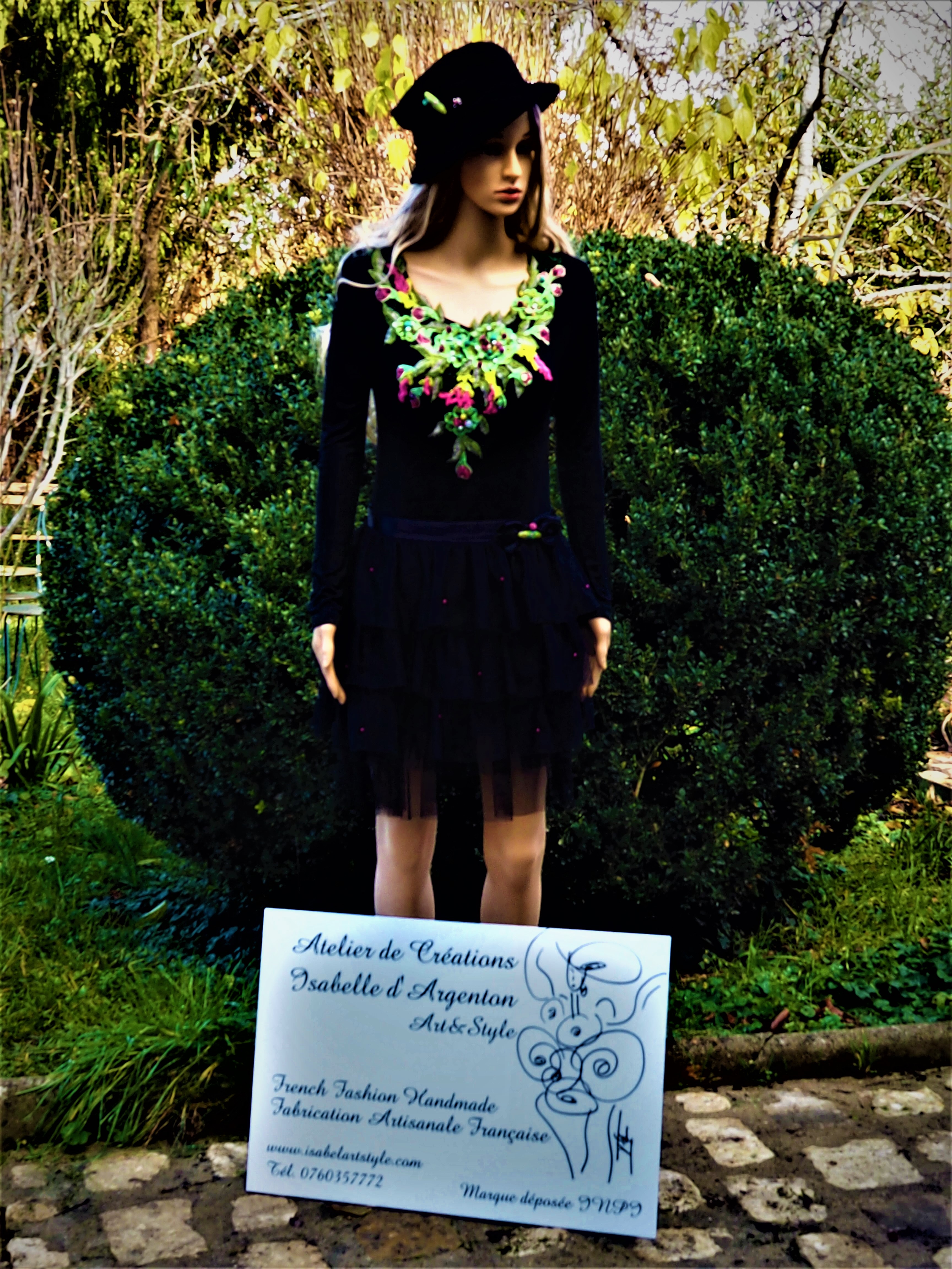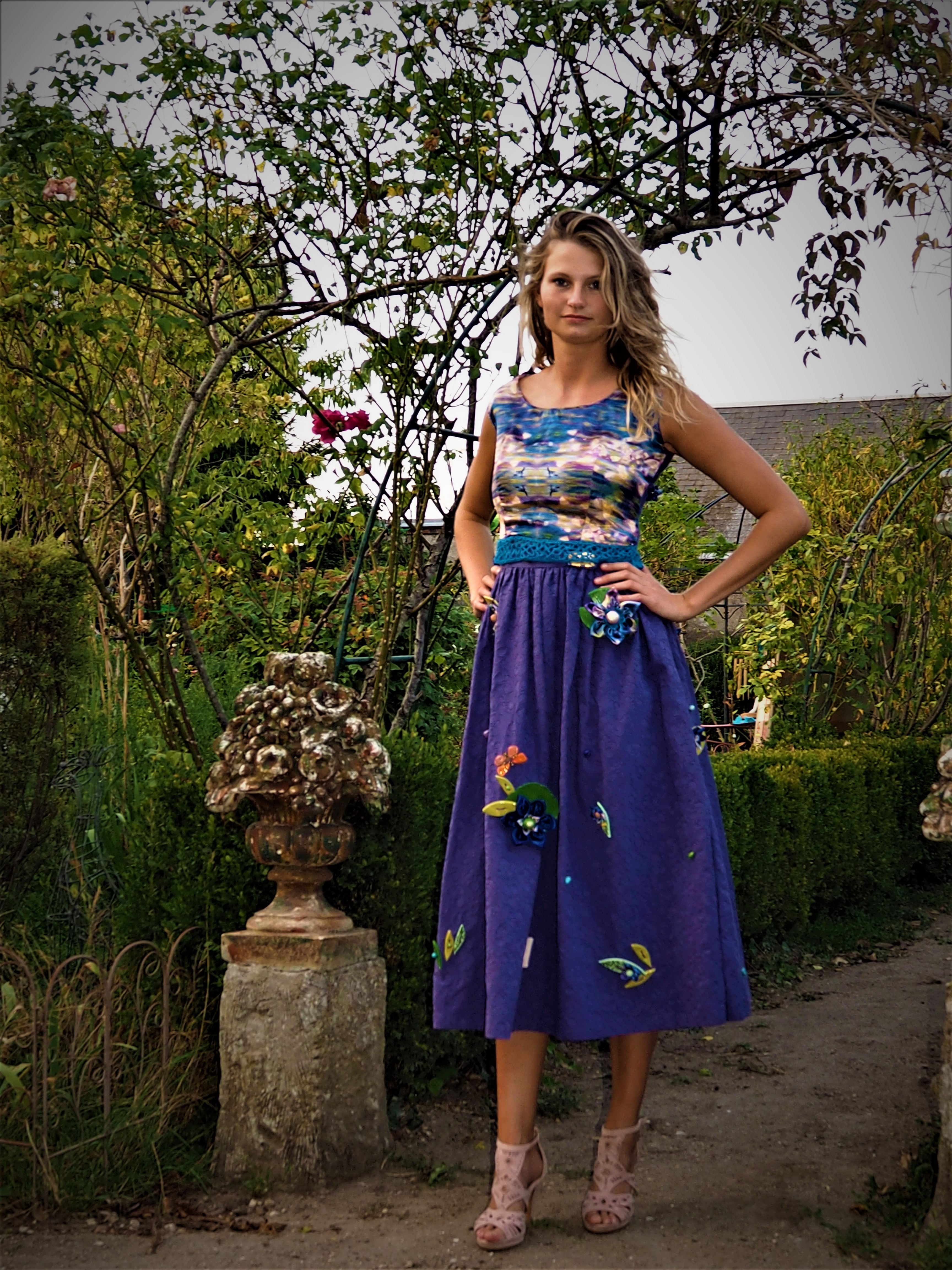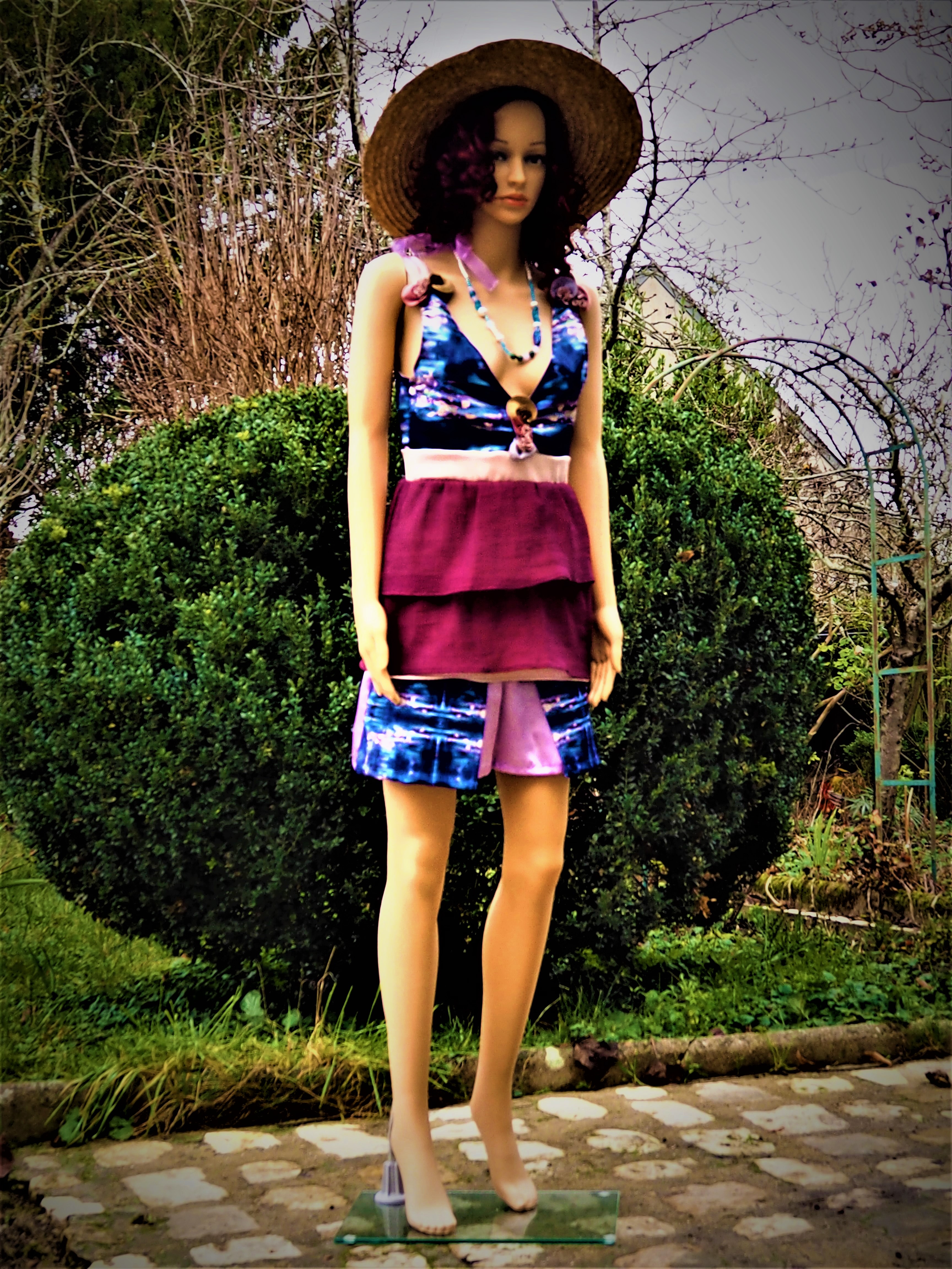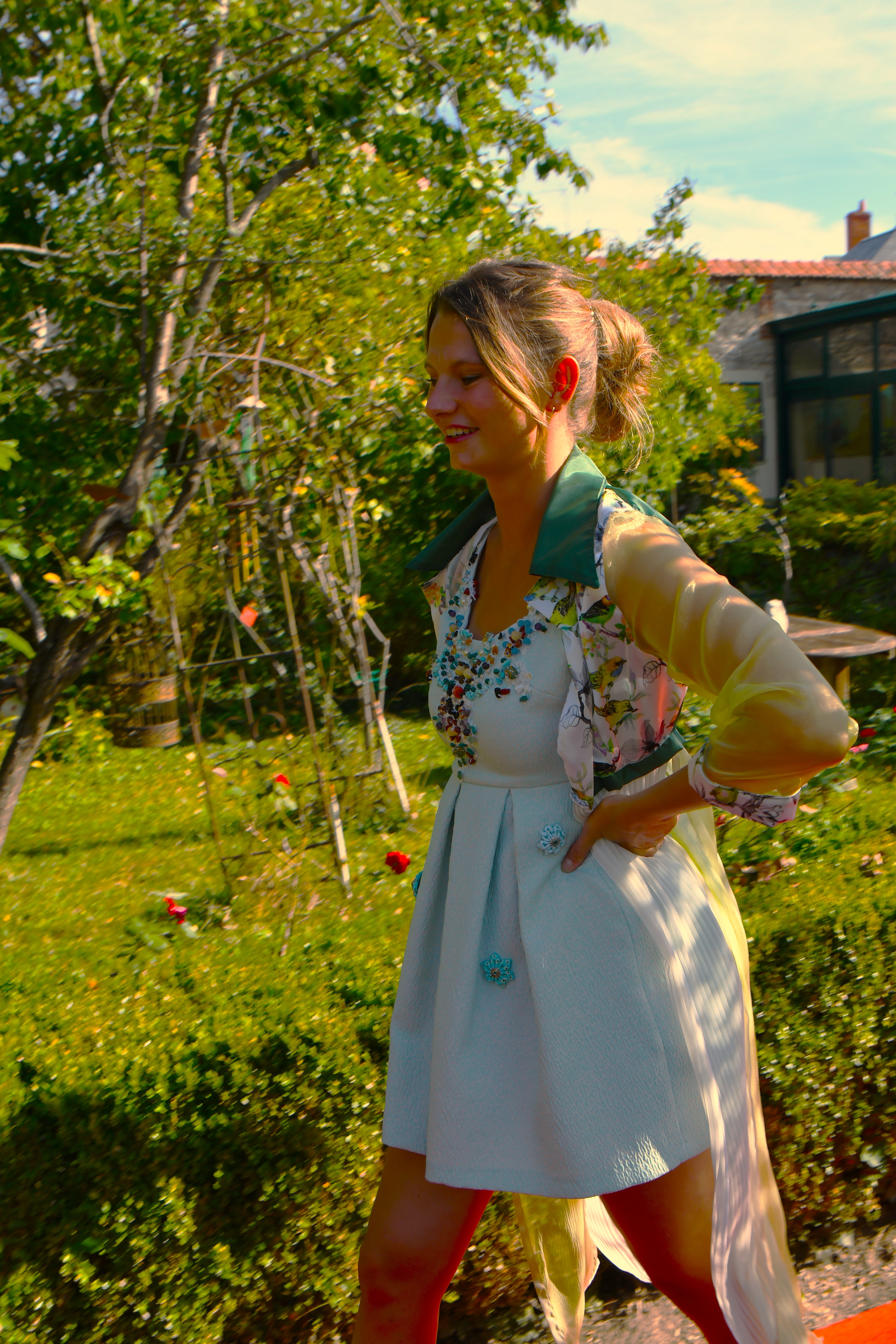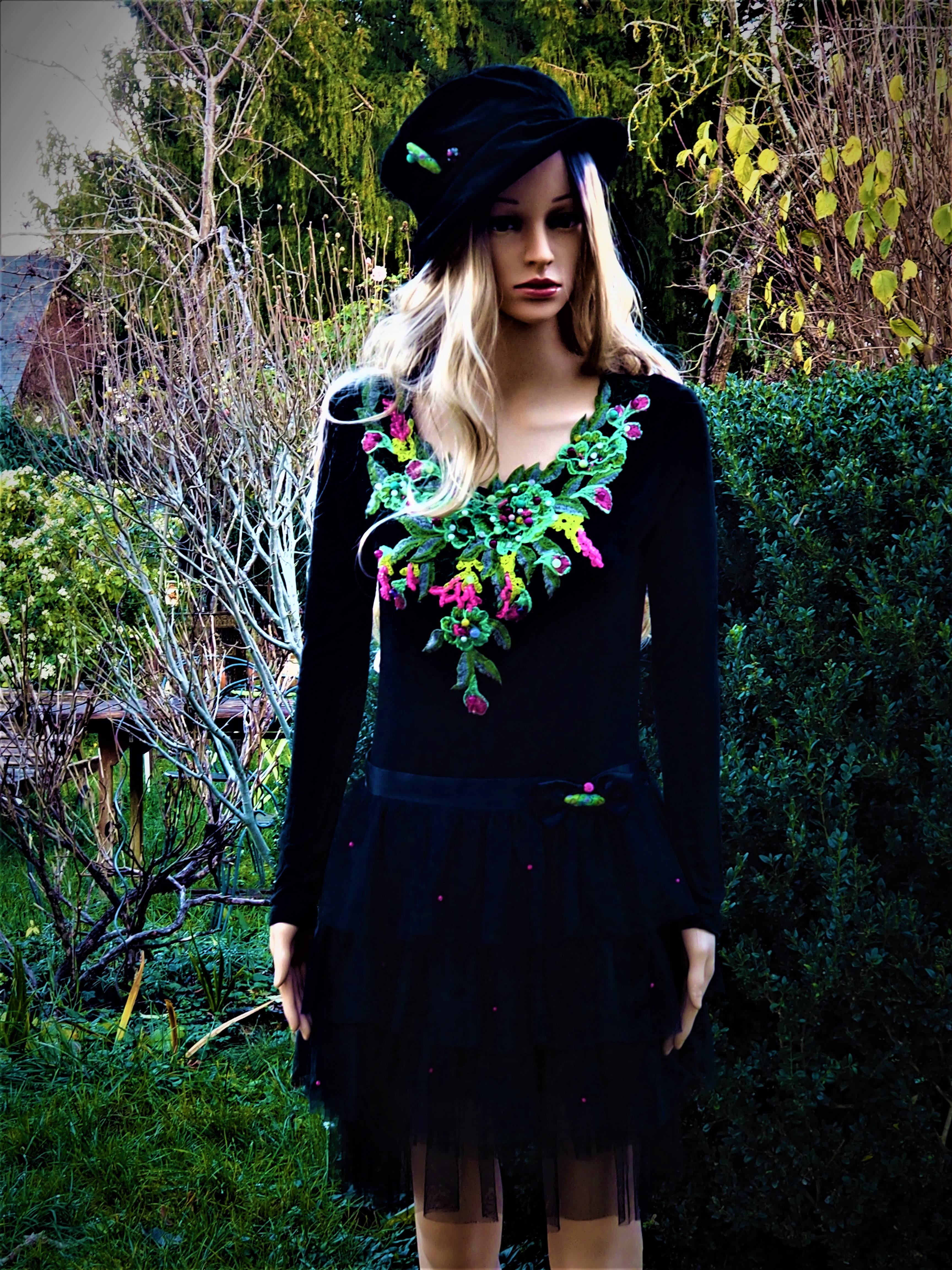 Comment ne pas aimer les jardins ! Les fleurs, les végétaux et leurs variétés. Je suis une artiste et je compose également des paysages dans la peinture mais je vis dans un jardin que j’ai composé avec amour et patience. La relation au vestimentaire est un lien important puisque les tissus naturels sont faits de fibres voire même de poils d’animaux. J’ai donc entrepris de faire des modèles avec cet esprit de jardinière pour composer des jardins poétiques différents sur le corps féminin. Vous porterez un peu de nature sur vous grâce aux créations stylisés d’Art&Style. Vous trouverez également de petits ensembles 2 ou 3 en 1 pour transformer votre silhouette à différents moments de la journée. Bijoux : pendentifs et bague « oiseau ». Lavage à la main à froid, 30° maxi. ou pressing à sec. Etendre à plat ou sur un cintre à épaules larges. (Mannequins : Léa M., Victoria L., Océane M. et Carine-Anne N.G).