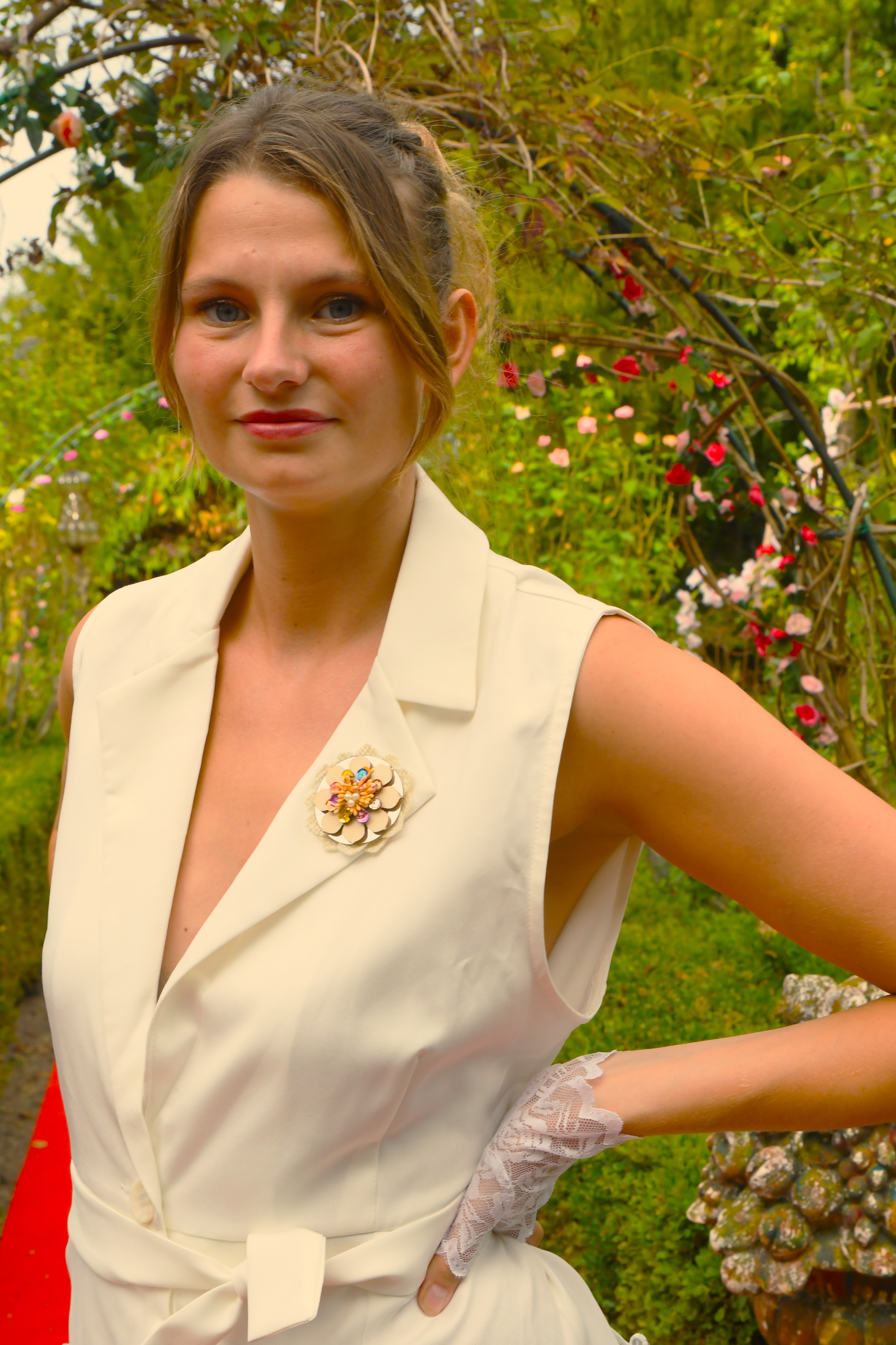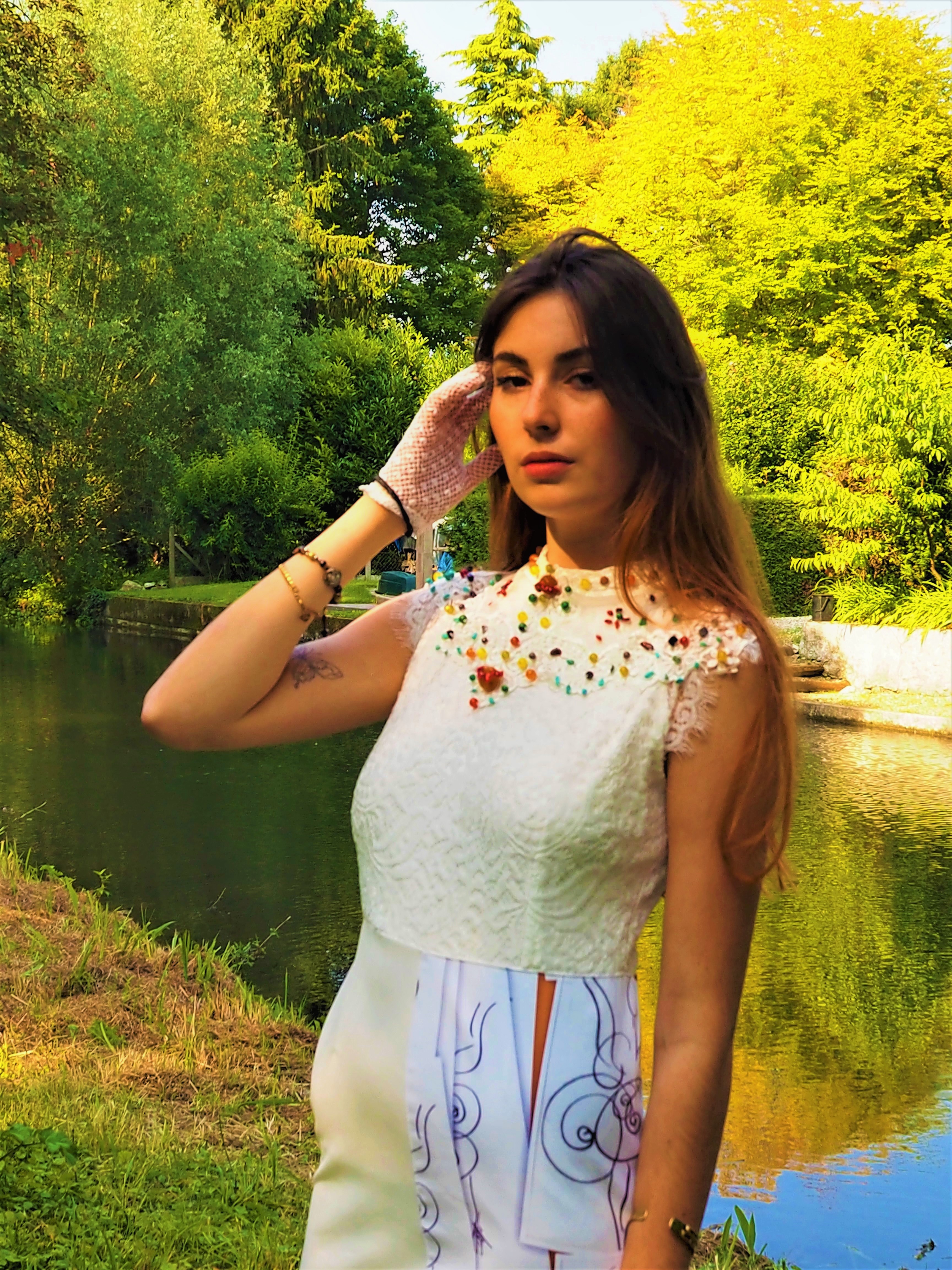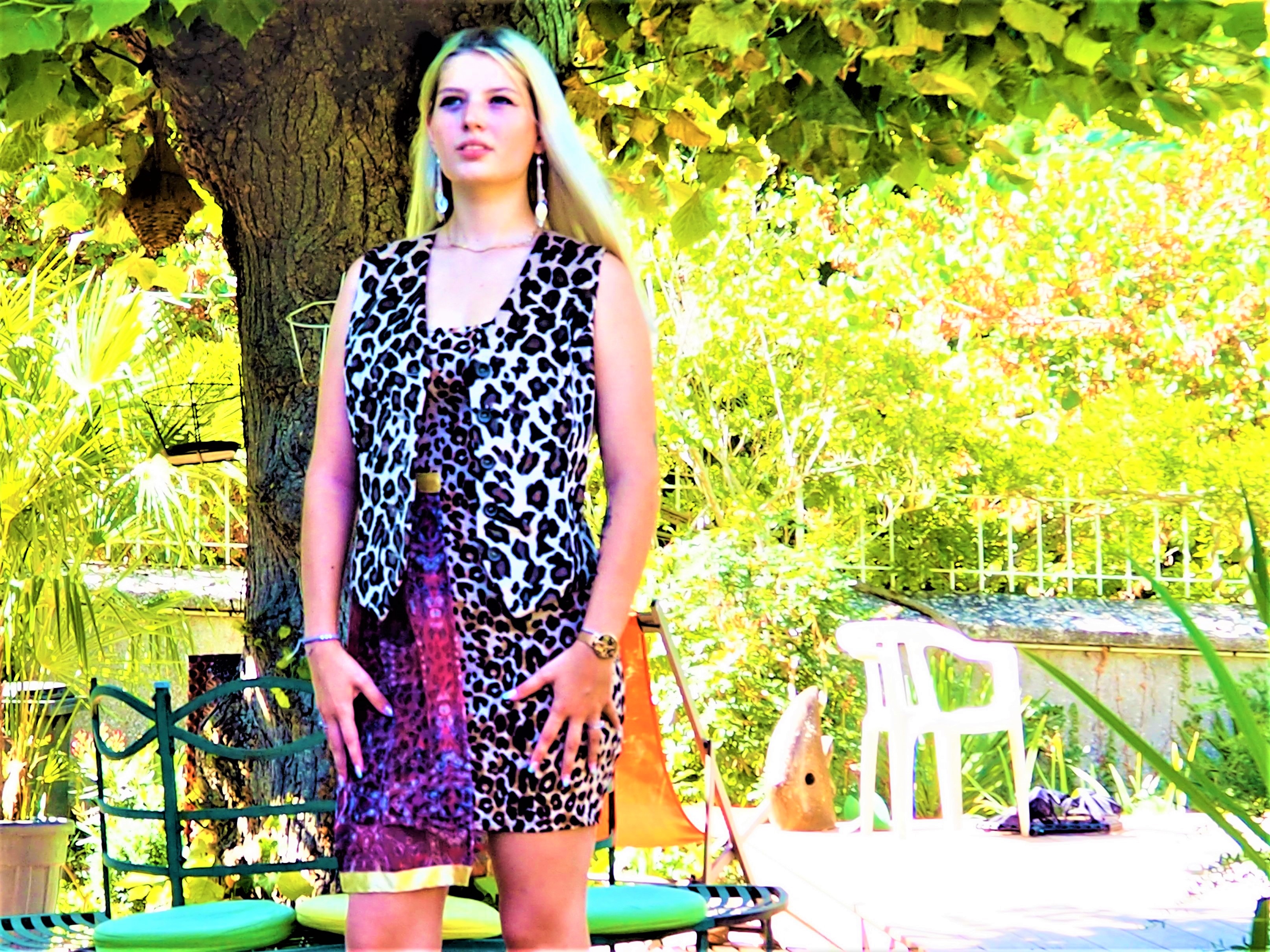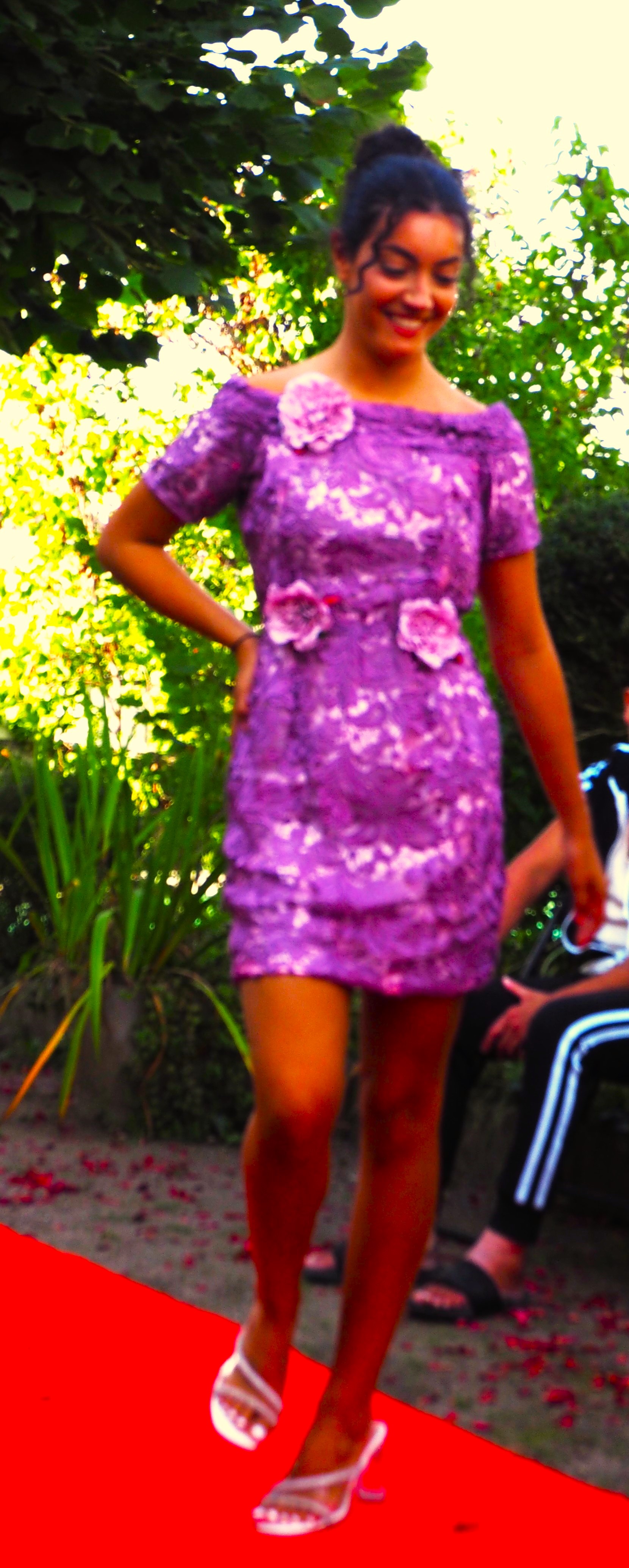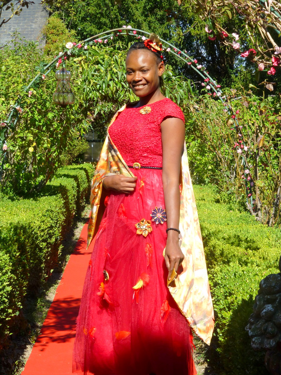 De ma vie à l’international, j’ai conservé la nostalgie des formes et des couleurs. Les matières jouent également un grand rôle dans la confection des modèles. Recyclage ou création, les deux sont en phase pour donner à la nature féminine une beauté élégante, fine et d’une grâce particulière. Les céramiques et les fleurs en tissu s’adaptent parfaitement sur les modèles. Bijoux : pendentif, bague, boucles d’oreilles. Petite idée pour les échancrures de certains modèles, vous pouvez porter dessous un tee-shirt en soie transparent ou un soutien-gorge en dentelles pour mettre en valeur vos formes sans provoquer le regard . (Mannequins : Léa M., Victoria L., Aurélie W., Vanessa B., Océane M., Carine-Anne N.G).